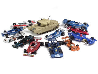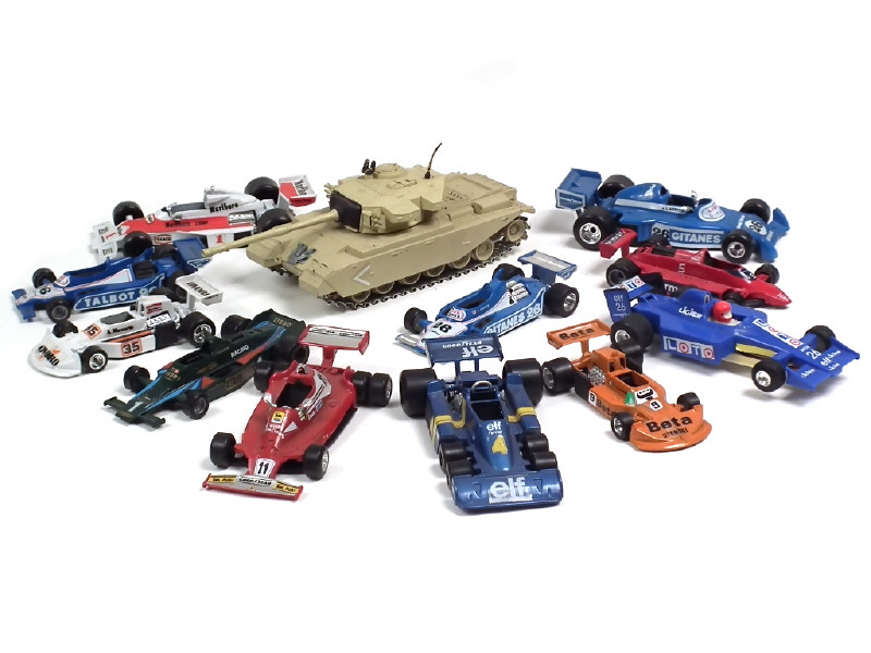 différentes échelles - miniatures reproduisant notamment les modèles : LIGIER (3 exemplaires différents dont une de circuit électrique), LOTUS, ALFA ROMEO, FERRARI, MARCH (2 exemplaires différents), Mc LAREN & TYRRELL - on y joint un char CENTURION MK 5 de la marque (avec manques & petits détails de peinture ajoutés)