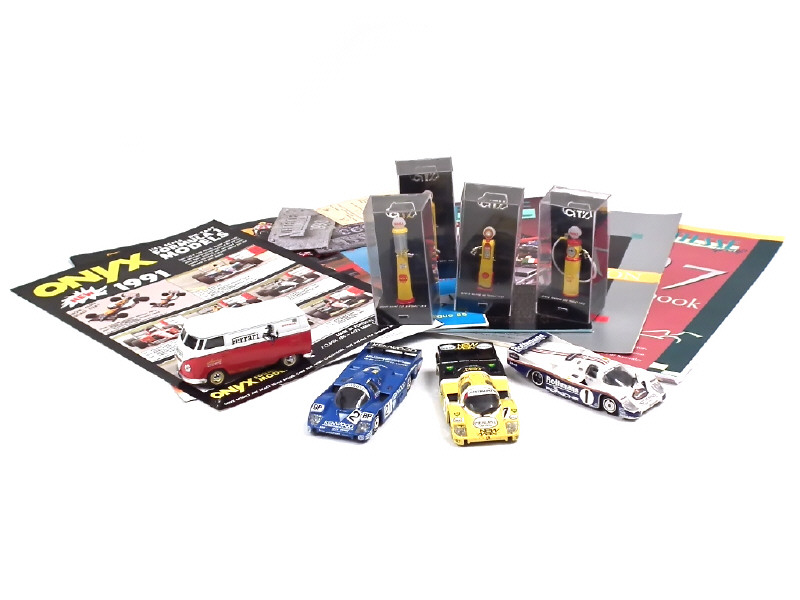 comprend : VOLKSWAGEN COMBI 'FERRARI' & PORSCHE 356 (3 exemplaires différents) - avec manques - on y joint 9 catalogues de la marque & 4 pompes à essence 'SHELL' de la marque CITY