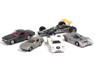 états de 'A' à 'D' - comprend : BRAHBAM F1 (échelle 1/32ème), LOLA T 212, FORD GT J, MASERATI 3500 & ALFA ROMEO GIULIA 1600 CANGOURO (un éclat majeur sur l'aile avant gauche) - quelques carrosseries encrassées