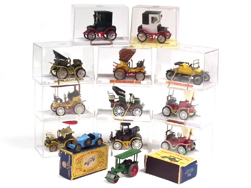 miniatures reproduisant notamment les modèles : PEUGEOT, PANHARD, RENAULT & DELAHAYE - on y joint AVELING & PORTER rouleau compresseur (petits traces d'oxydation) & BUGATTI type 35 (petites traces d'oxydation), de la marque MATCHBOX (boîtes en état 'c') - quelques petits manques