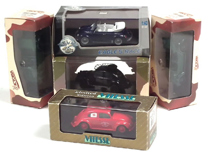 comprend : cabriolet HEBMULLER, MILITARY POLICE (2 exemplaires identiques), gazogène type 92, CROIX ROUGE 1947 (édition limitée numérotée 5976/8000 exemplaires avec boîte en état 'c') & cabriolet 1303 (boîte en état 'c') - on y retrouve lesmarques VICTORIA, VITESSE & UNIVERSAL HOBBIES