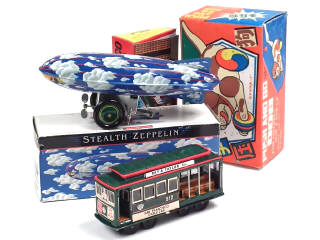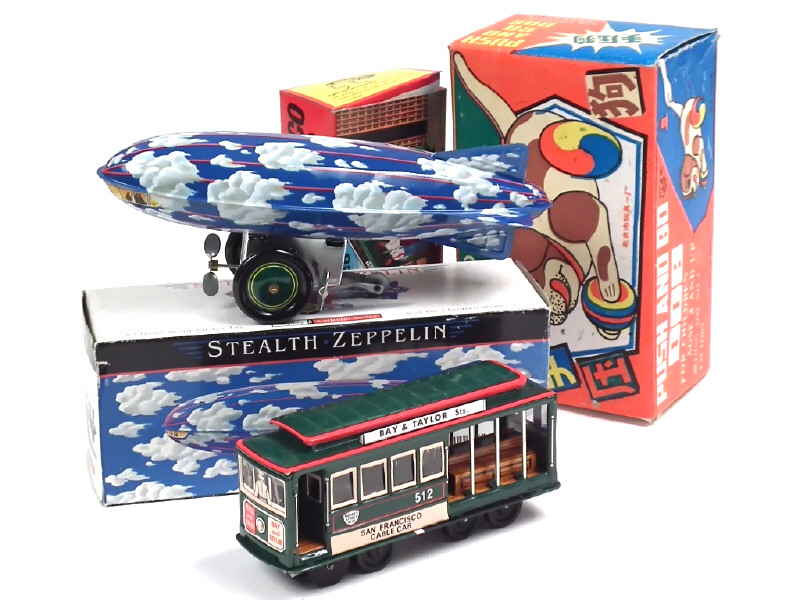 comprend : 'PUSH AND GO DOG', moteur à ressort (fonctionne) avec câle, 'ZEPPELIN' moteur à ressort (fonctionne) & 'SAN FRANCISCO CABLE CAR' moteur à friction avec bruiteur (fonctionne) - on y retrouve notamment la marque SCHYLLING