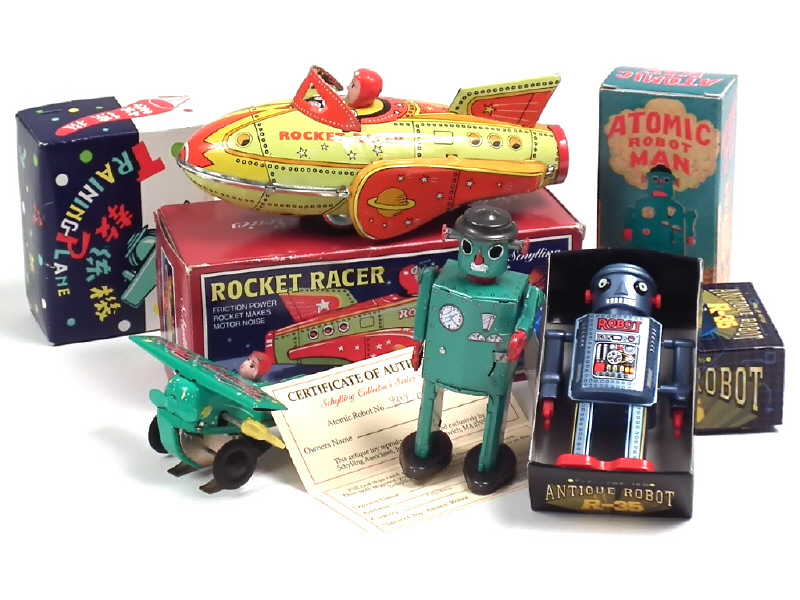 comprend : ROCKET RACER longueur 19 cm, en état 'B' avec moteur à friction (fonctionne), ANTIQUE ROBOT R-35, hauteur 11 cm, moteur à ressort (fonctionne), ATOMIC ROBOT MAN, hauteur 12 cm, moteur à clef (fonctionne) avec certificat numéroté 4684 & TRAINING PLANE, envergure 10,5 cm, moteur à ressort (fonctionne) avec notice - on y retrouve notamment les marques : SCHYLLING & MASUDAYA
