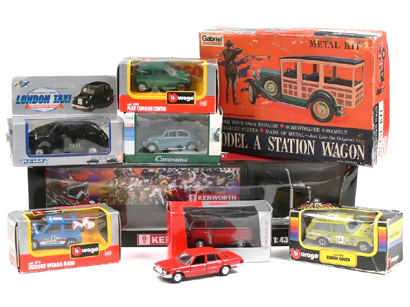 miniatures reproduisant les modèles : KENWORTH, FIAT, AUSTIN, VOLKSWAGEN (2 exemplaires différents), SUSUKI, RANGE ROVER & MERCEDES (en état 'C' & sans boîte) - on y retrouve les marques : SCHUCO, CARARAMA, BBURAGO, WELLY & NEW RAY - on y joint un kit en métal (FORD A STATTION WAGON) à monter de la marque GABRIEL (semble complet)