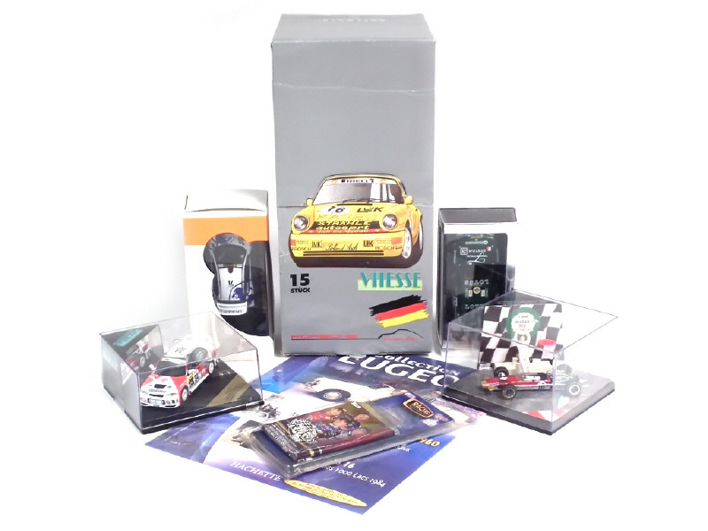comprend : MITSUBISHI LANCER, PEUGEOT 206 WRC, LOTUS ESPRIT S 300 & LOTUS FORD F1 1968 (GRAHAM HILL) - on y retrouve les marques : VITESSE, SPARK & IXO MODELS - on y joint une boîte-présentoir vide de 15 PORSCHE CARRERA, un fascicule sur la collection PEUGEOT de la marque HACHETTE & un sachet de 4 cartes 'NASCAR' jamais ouvert