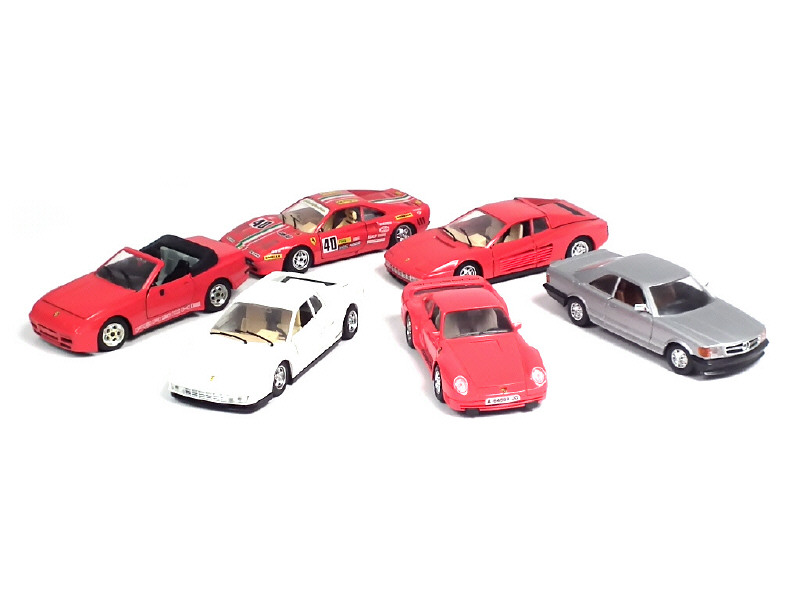 états de 'A' à 'C' - échelle 1/24ème - comprend : MERCEDES 500 SEC, FERRARI TESTAROSSA (2 exemplaires dont un avec un éclat majeur sur le capot-moteur), GTO, PORSCHE 944 & 959 - on y retrouve les marques : GUILOY, MAJORETTE & BBBURAGO - quelques manques & parties cassées