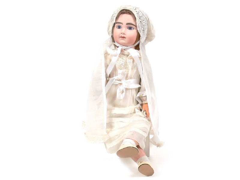 hauteur 51 cm - avec tête JUMEAU (reproduction), face longue, yeux bleus en verre & corps ancien articulé en bois - vêtements de communiante (fabrication artisanale d'époque)