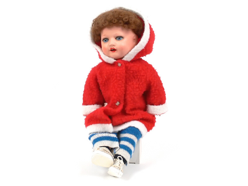 hauteur 53 cm - corps articulé en bois (avec manques sur les jambes) - yeux bleus en verre - bouche ouverte - signature au cou