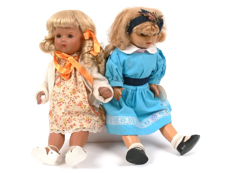 hauteur 38 cm - années 50 - corps articulé - yeux dormeurs marron (défectueux) - bouche ouverte avec rangée de dents - perruque d'origine (une partie à recoller) - quelques doigts endommagés