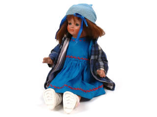hauteur : 50 cm - corps articulé - bouche fermée - yeux dormeurs bleus - perruque d'origine - vêtements artisanaux anciens - jambes restaurées - quelques accessoires non d'origine