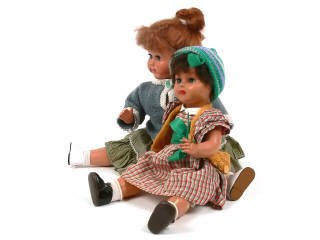 hauteur 44 cm - inscription 'RATTI MADE IN ITALY 50' sur la nuque - corps articulé - yeux dormeurs bleus - bouche fermée - un pouce cassé - avec manques - robe & chaussures anciennes d'origine