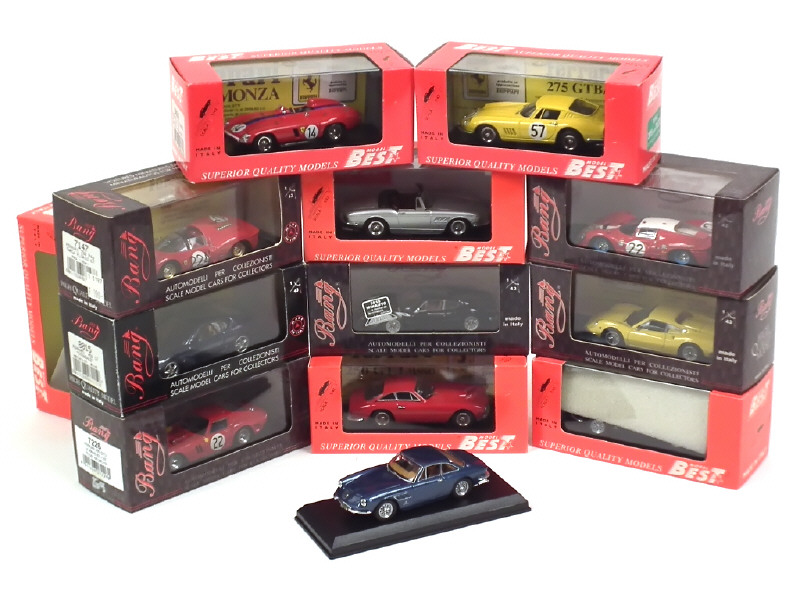 miniatures reproduisant les modèles : DINO 206, DINO 246 GT, 250 GTL, 250 GTO, 330 (4 exemplaires différents), 275, 412 P, 456 GT & 750 MONZA - on y retrouve les marques : BANG & BEST MODEL