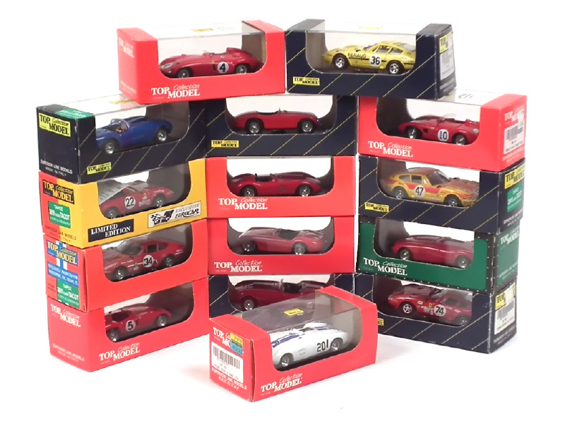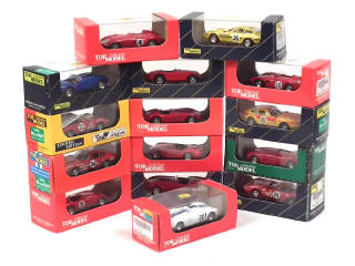 miniatures reproduisant les modèles : 121 LM (2 exemplaires différents), 212, 340, 365 GT B4 (5 exemplaires différents dont 2 éditions limitées numérotées 960 (plusieurs décalques endommagés avec manques) & 586/1500 exemplaires), 375 (4 exemplaires différents dont 2 boîtes en 'c'), 500 MONDIAL & 625 LM