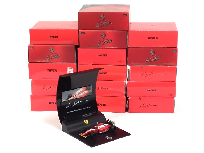 collection 'LA STORIA FERRARI' - miniatures reproduisant notamment les modèles : 156, 312 T, 375, 625, 641 (avec dépliants présentant les différentes caractéristiques techniques du modèle) - on y joint : 4 FERRARI (DINO 246, 126 C2 F1, 312 F1 & 312 B2 F1 de la marque HOTWHEELS collection 'LA STORIA' en état 'A,b'