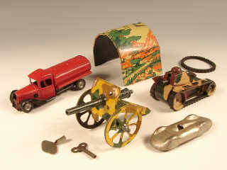 longueur 10 cm - moteur à clef (à revoir) - une patte de fixation d'un garde-boue cassée - mécanisme de pierre à briquet à revoir - avec clef - on y joint une chenille supplémentaire
