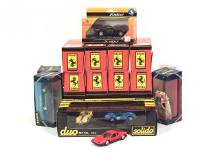 miniatures reproduisant notamment les modèles : 2,5 L, DAYTONA, BB (2 exemplaires différents dont une avec parties cassées), 250 GT, 250 GTO (2 exemplaires différents), 512 (2 exemplaires différents), 500 & 550 - 2 modèles regroupés dans un coffret - on y joint 2 FERRARI BB (dont une en état 'D'), 250 GTO & 365 GTB 4 (état 'C') de la marque VEREM