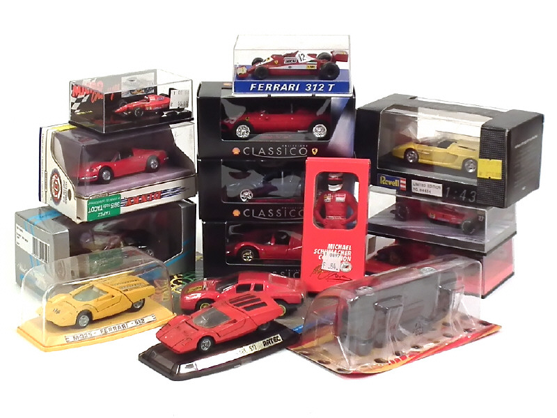 miniatures reproduisant notamment les modèles : 330 P4, 156 F1, 365 GT4 BB, ENZO, 355, MYTHOS, DINO 246 GTS, 512 (2 exemplaires différents), 312T & F1 1977 (édition limitée à 7777 exemplaires) - on y retrouve notamment les marques : MINICHAMPS (un modèle à l'échelle 1/64ème), DINKY MATCHBOX, PILEN (dont une boîte en état 'c'), REVELL & CHAMPION