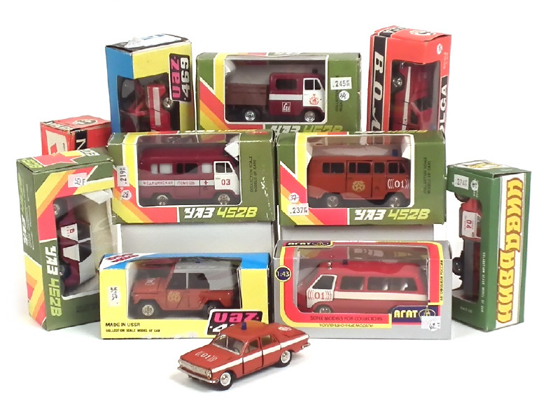 miniatures reproduisant notamment les modèles : UAZ (6 exemplaires différents dont un avec petites traces de métal fatigue), LADA & VOLGA (2 exemplaires différents) - on y retrouve notamment la marque NOVOEXPORT