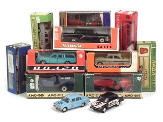 miniatures reproduisant notamment les modèles : LADA (3 exemplaires différents), VOLGA, RUSSO-BALT & AMO (2 exemplaires différents) - on y retrouve notamment la marque : NOVOEXPORT