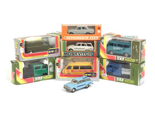 miniatures reproduisant notamment les modèles : RAF & MOSKVITCH (3 exemplaires différents) - une porte & un vitrage désolidatisés de leur base - on y retrouve notamment la marque NOVOEXPORT