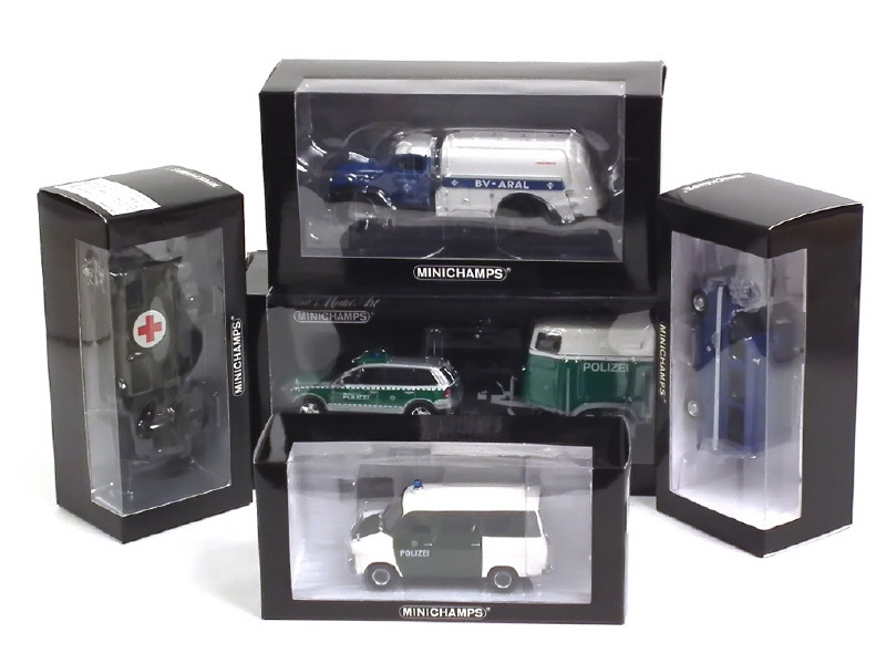 séries limitées - comprend : VOLKSWAGEN TOUAREG avec van 'POLIZEI (tirage non limité), FORD TRANSIT 'POLIZEI', FORD TRANSIT minibus 'THW', FORD TRANSIT 3500 citerne 'BV-ARAL' & MERCEDES-BENZ UNIMOG 404 ambulance militaire