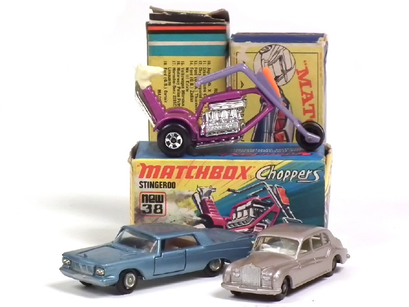 comprend : CHOPPERS STINGEROO, ROLLS ROYCE PHANTOM V & CHRYSLER IMPERIAL (quelques petites traces d'humidité) - on y retrouve les marques : LONE STAR & MATCHBOX