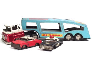 états de 'D' à 'E' - comprend : un camion-transport de voitures & 2 voitures pompiers & 'POLICE' - avec manques & parties cassées - traces d'oxydation