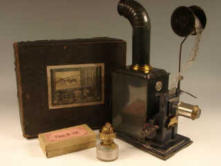 ERNST PLANK (ALLEMAGNE) Cinématographe à pétrole en tôle peinte & laiton gris vert métal