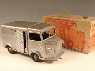 longueur 35 cm - moteur mécanique (fonctionne) - phares électriques - la société CHR de CLICHY avait racheté certains outillages J.R.D. en 1965 pour produire le CITROËN H sous différentes nouvelles versions, avec des roues chromées, munies de pneus crantés - boîte du fourgon téléguidée
