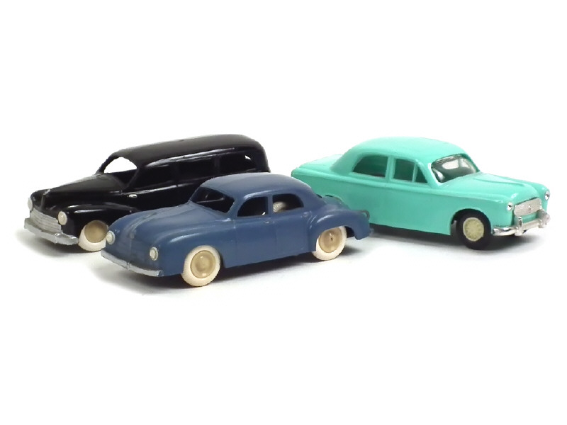 comprend : PEUGEOT 403 (état 'A-', version avec phares scintillants & vitrage, pare-chocs arrière recollé), 203 commerciale & RENAULT FREGATE (version avec crochet d'attelage) - carrosseries plus ou moins déformées