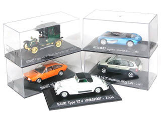 miniatures reproduisant les modèles : AG1 Taxi de la Marne 1910, VIVASPORT YZ4 cabriolet 1934, R15 TL 1976, LAGUNA CONCEPT CAR 1990 & SCENIC RX4 2000 - on y retrouve les marques : NOREV & UNIVERSAL HOBBIES - une boîte état 'a'