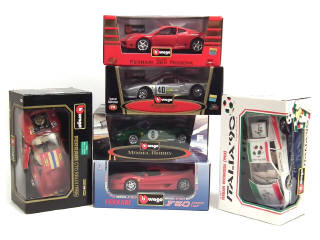 échelle 1/18ème - comprend : 250 LM, 360 MODENA, 550 MARANELLO (2 exemplaires différents), 512 TESTAROSSA, GTO (2 exemplaires différents), F40 (capot & pare-chocs avant à recoller, quelques petits manques) & F50 (2 exemplaires différents)