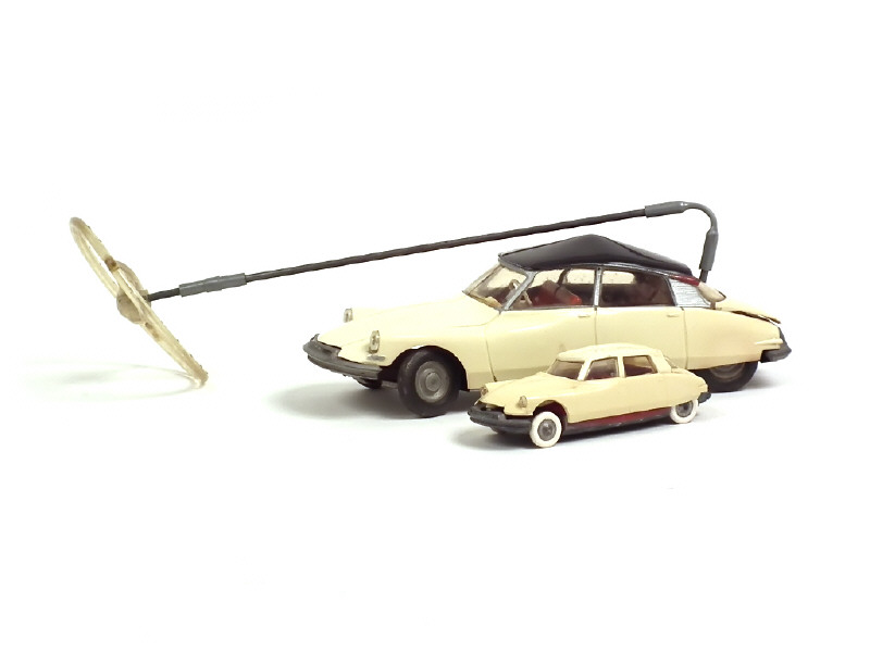 longueur 22 cm - avec volant (quelques parties cassées & recollées) & tige directionnelle - carrosserie déformée - traces d'oxydation - chromes plus ou moins ternis - avec bon de contrôle - on y joint une CITROEN DS 19 de la marque (échelle 1/43ème) en état 'D' (importantes traces de métal fatigue avec manques sur le châssis & carrosserie déformée)