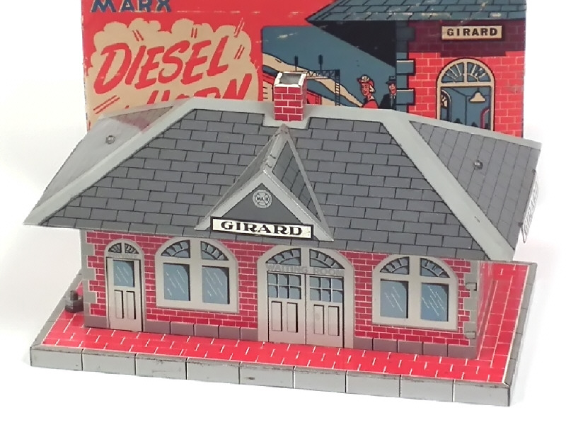MARX TOYS (USA) Gare 'GIRARD' en tôle lithographiée rouge, gris foncé & blanc