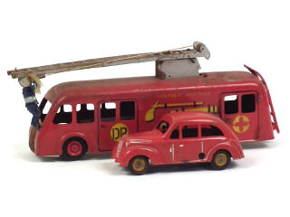 longueur 25 cm - moteur à clef (à revoir) - version avec échelle simple, sirène 2 tons (à revoir) & pompier - traces d'oxydation plus ou moins importantes - carrosseries encrassées avec quelques éléments déformés & manquants - pneus endommagés