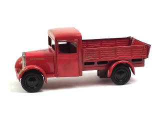 longueur 42 cm - version sans phare - moteur à clef (fonctionne) - mentions 'CAMIONNAGE' sur le fronton de la cabine, 'RENAULT' de part & d'autre du capot & 'TD' sur l'aile avant gauche - extrémités de pare-chocs avant & ridelle basculante (avec quelques petits manques de peinture) plus ou moins déformées - très légères traces d'oxydation sur la calandre & le moteur - petites rayures par endroits