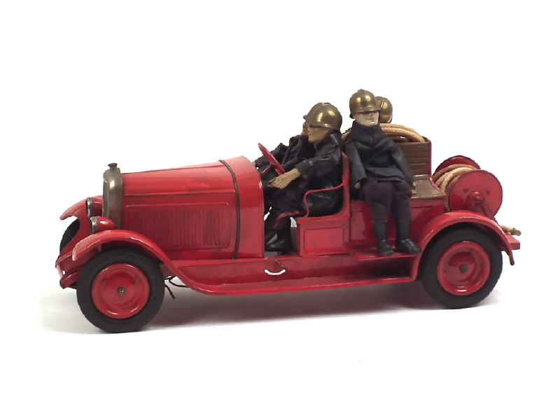 longueur 39 cm - fabriquée de 1933 à 1934 - moteur à clef (fonctionne) - direction par le volant - avec phares électriques (non testés), un dévidoir, 2 lances & 4 pompiers (dont 3 collés sur les banquettes) - petits manques & parties repeintes - volant non d'origine - quelques retouches plus ou moins importantes