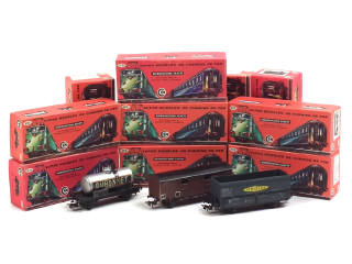 comprend : 2 citernes 'AVIA' & 'DUBONNET', 2 couverts dont un 'EVIAN' (incomplet), porte-containers, tombereaux à clairevoie (2 exemplaires), céréalier 'SIMOTRA', isotherme à lait & frigorifique (incomplet) - avec notices