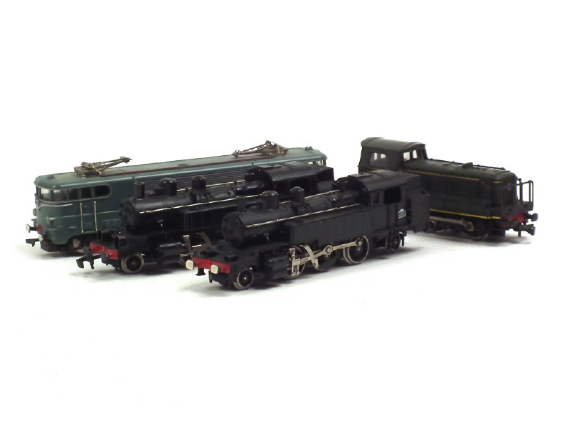 non testés - comprend : locomotives-tenders à vapeur type 131 TB42 'SNCF' (2 exemplaires dont une avec boîte en état 'b'), une motrice diesel type C61006 'SNCF' & une motrice électrique type DB 16009 'SNCF' - on y joint une boîte de la marque