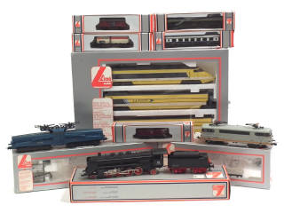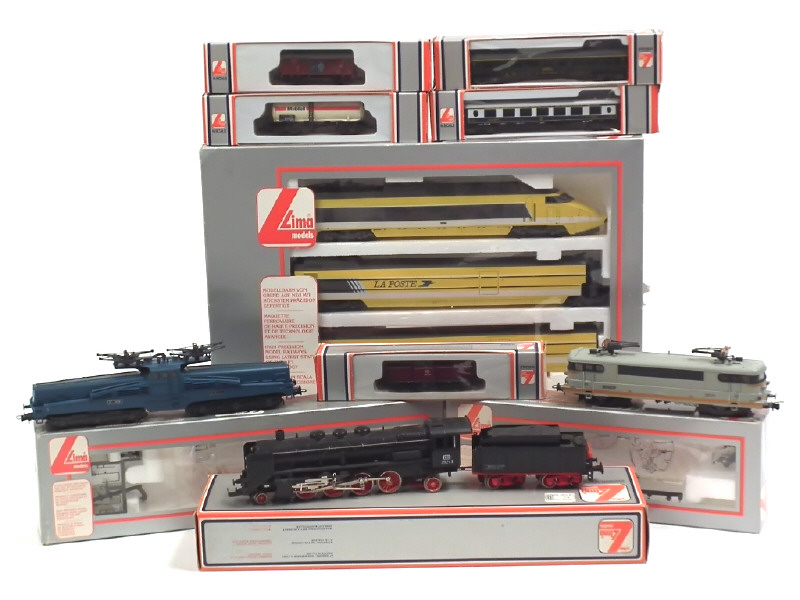 comprend : TGV 'LA POSTE' (4 éléments regroupés dans un coffret), locomotive à vapeur type 141 39243 DB avec tender, motrice électrique type 9520 'SNCF' & motrice électrique type CC14018 CROCODILE 'SNCF' - non testés - on y joint 2 voitures de voyageurs (pullman de la CIWL & première classe 'SNCF'), motrice diesel V100 1026 DB, wagon-citerne 'MOBILOIL' & couvert de la marque à l'échelle 'N', 3 wagons de la marque ROCO & 5 de marque indéterminée (échelles 'N')