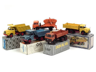 comprend : MAN 32240 benne-carrière, IVECO multi-benne ATLAS, MERCEDES 2636 plateau à ridelles basculant (une extrémité de pare-chocs arrière déformée), 2624 plateau à ridelles basculant (rétroviseurs à refixer, éclat majeur sur l'arrière du plateau) & MAGIRUS-DEUTZ benne-carrière - on y retrouve les marques : CURSOR MODELL, NZG & CONRAD