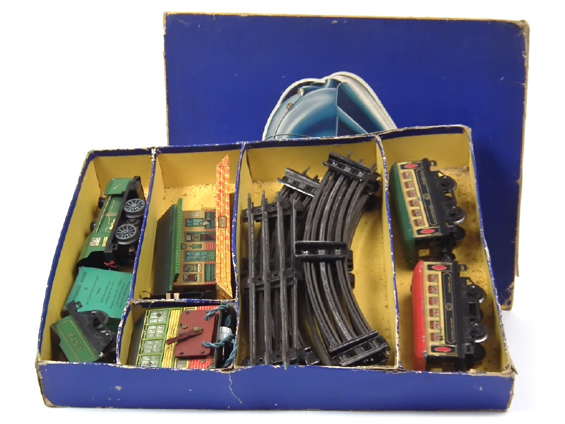 non testé - contient : une locomotive à vapeur type 020 avec tender, 2 voitures PULLMAN (dont une en état 'D'), 9 rails courbes, 2 rails droits (ternis), un transformateur, une petit quai gare en tôle lithographiée, 13 broches d'assemblage & une boîte contenant un anti-parasites de la marque - quelques traces d'oxydation par endroits - contenu non conforme