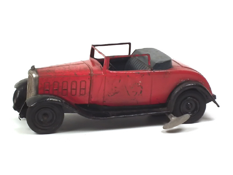 état proche de l'état 'D' - longueur 30 cm - moteur à clef (fonctionne) - avec clef & direction - carrosserie & aménagement intérieur non repeints - manque phares, roue de secours & quelques accessoires - nombreuses parties repeintes