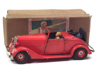 longueur 33 cm - version de 1938 avec phares électriques (non testés), 4 aérateurs de capot horizontaux, pare-chocs rapportés & porte conducteur ouvrante - moteur à clef (fonctionne) - avec clef (partie supérieure repeinte) & direction par le volant - avec passagère, chien (une oreille incomplète & une autre recollée) & valise (ces 3 derniers éléments sont en état 'A-') - pneus séchés & plus ou moins craquelés - boîte encrassée & décolorée avec illustration en état 'b'