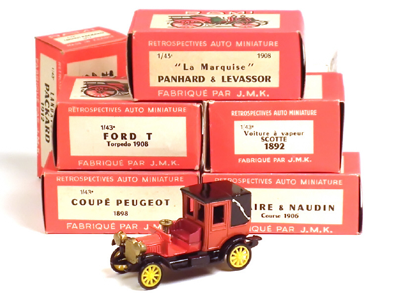 comprend : SIZAIRE & NAUDIN 1906, PANHARD & LEVASSOR 1908, LANDAULET PACKARD 1912, PEUGEOT coupé 1898, SCOTTE 1892 (boîte en état 'c') & HAUTIER 1898 (boîte non conforme avec annotations)
