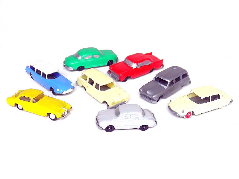 échelle 1/87ème - réalisations en plastique - états de 'B' à 'R' - miniatures reproduisant les modèles : CITROEN DS19, PEGASO Z 103, RENAULT DOMAINE (un défaut de moulage sur le toit), SIMCA CHAMBORD, SIMCA MARLY, RENAULT DAUPHINE, PANHARD DYNA Z & CITROEN ID19 break - on y retrouve les marques : JOUEF, ANGUPLAS (série MINI CARS) & CADUM PAX - nombreux petits manques