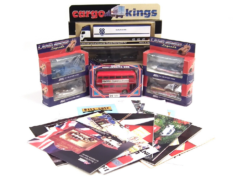 différentes échelles - comprend : BLUEBIRD, RAINTOL MOBIL SPECIAL, SPIRIT OF AMERICA, THRUST 2, SSC & VOLVO FH 12 semi-remorque fourgon 'COOP' - on y joint catalogues & dépliants de la marque & un autobus londonnien à 2 étages de marque indéterminée