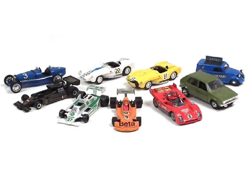 états de 'A' à 'C' - comprend notamment : FERRARI 312 PB, 250 TR (2 exemplaires différents dont un avec traces de métal fatigue sur le plancher & l'autre avec pare-brise & volant à refixer), BUGATTI ,WILLIAMS FW-07, LOTUS MK 3, VOLKSWAGEN GOLF (carrosserie encrassée) - on y retrouve les marques : PROJETTO K, BRUMM, MEBETOYS & YAXON - on y joint une MARCH 76 I de la marque JOHN DAY (en état 'A.-')
