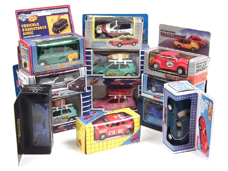 différentes échelles - miniatures reproduisant notamment les modèles : MERCEDES, VOLKSWAGEN & BUGATTI - on y retrouve notamment les marques LOMI, FREE & EASY, EURO-PLAY & SIMBA TOYS - plusieurs modèles avec moteurs à friction & bruiteurs (non testés) - 3 blisters de boîte manquants