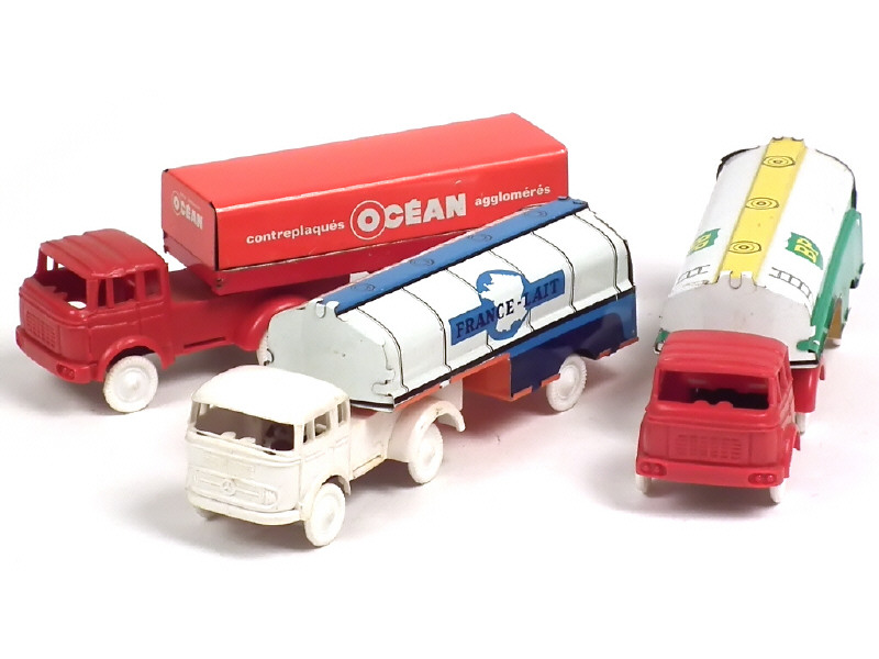 comprend : MERCEDES citerne 'FRANCE-LAIT' (traces d'oxydation sur le plancher), BERLIET GAK plateau à ridelles bâche 'OCEAN' & BERLIET GAK citerne 'BP'